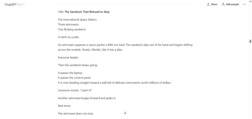 - The Co-Creator Way: “Act as a sci-fi writer. Explain Newton’s First Law using a high-stakes scenario on the International Space Station. Do NOT use examples involving cars or buses.”